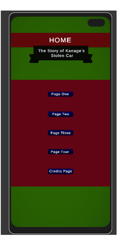 This is a functional storybook titled the story of Kanage's stolen car. It is made up of six pages starting from the home page to page 1 then to page 2 then to page 3 and then to page 4 and finally the credits page.